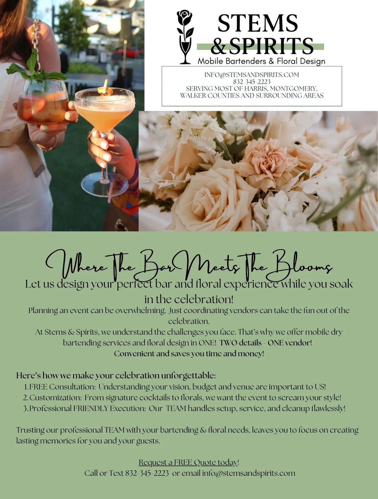 Quotes are not binding until contracts are signed and deposits received. We reserve the right to adjust quotes at any time prior to contract. Any changes after contract may require additional deposit. Our TEAM does our very best to accomodate any requests, however, market availability is unpredictable and substitutions may have to be made. We will always convey any substitutions in advance!